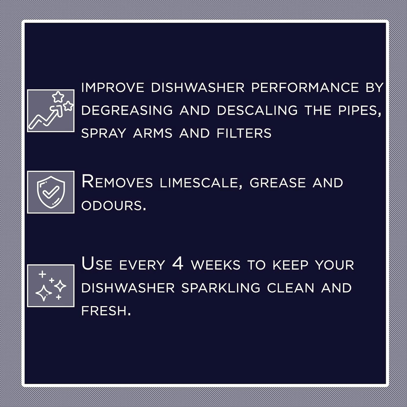<p><strong>• Enhances Cleaning Performance</strong><br />Softens water to boost detergent efficiency for spotless dishes.</p>