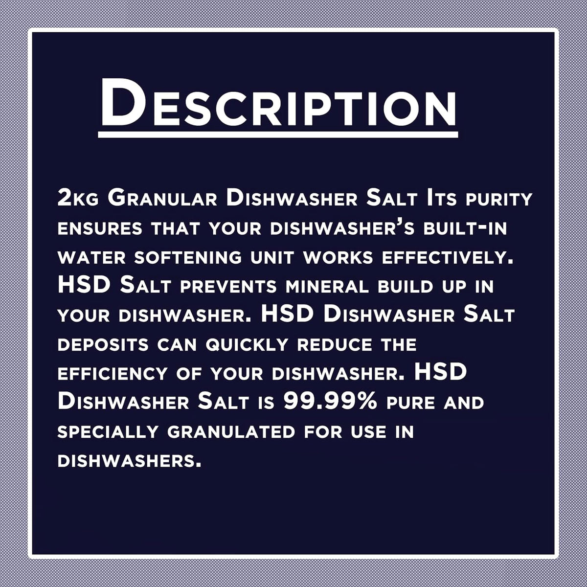 <p><strong>Short Description</strong><br />Keep your dishwasher performing at its best with this premium 2kg food-grade dishwasher salt. Designed to prevent limescale, improve cleaning efficiency, and protect your appliance. Suitable for all dishwashers and water softener systems.</p>